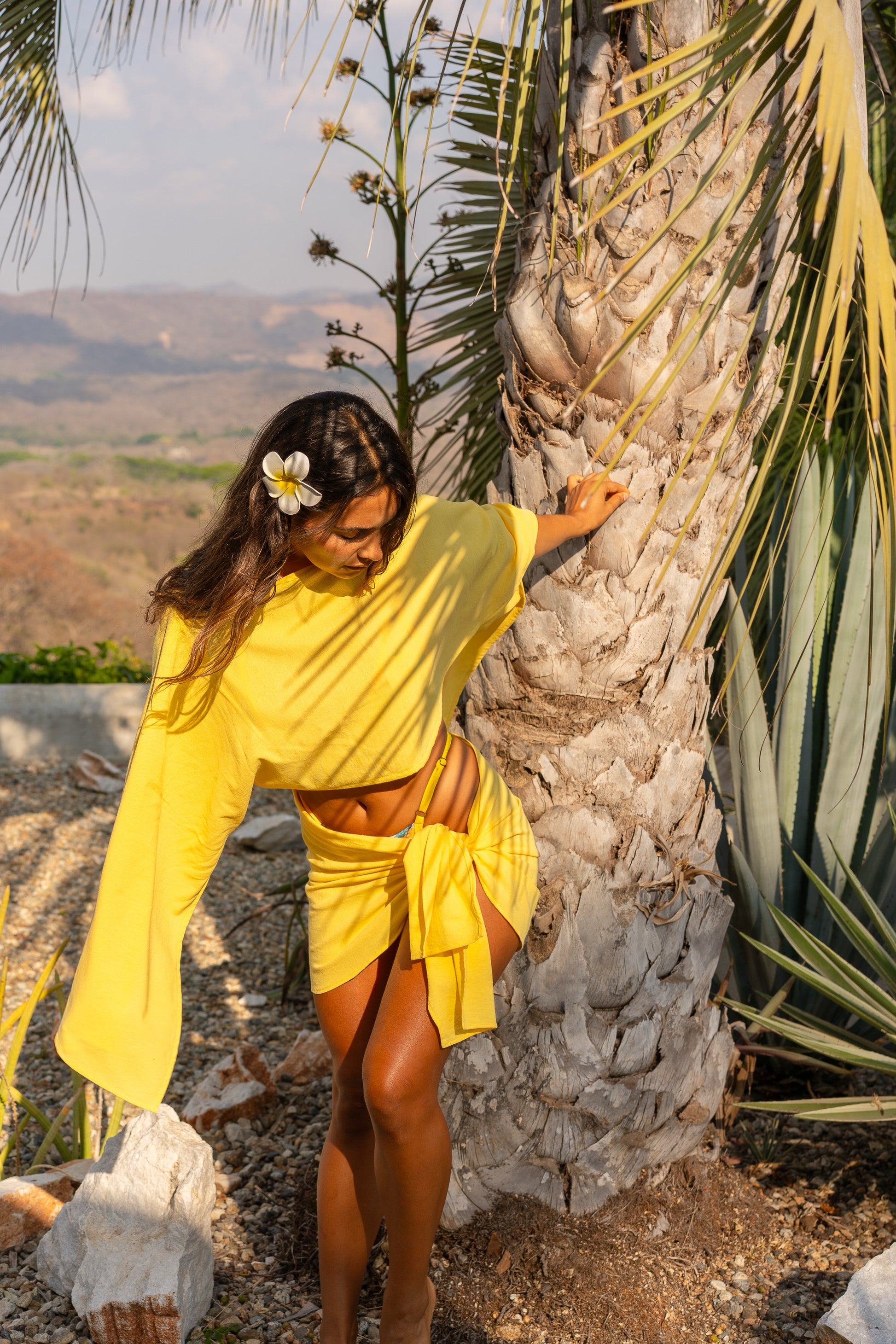 Detalles - Falda ajustable y blusa corta, con mangas abiertas de abajo.